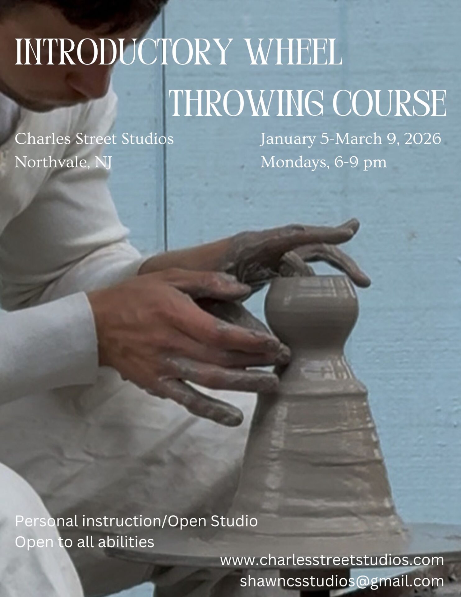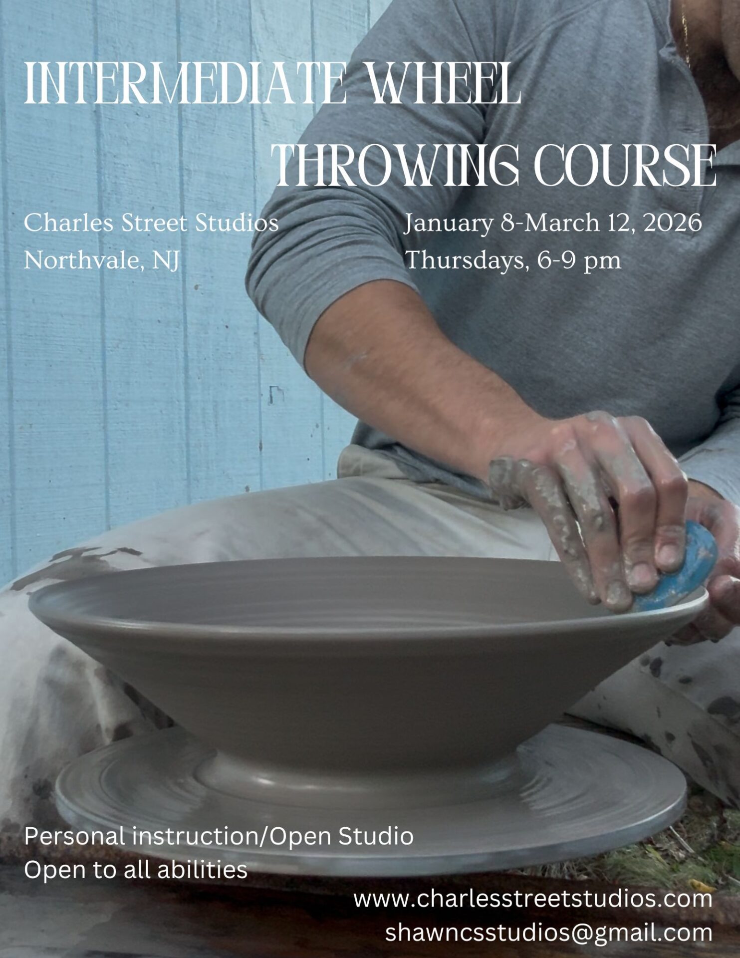Over the span of ten weeks, intermediate pottery students will progress their fundamental understanding of wheel throwing at Charles Street Studios in Northvale, New Jersey. The first two hours of class will be demonstration-based, while the remaining hour will be used for students to work at their own pace and clean up.